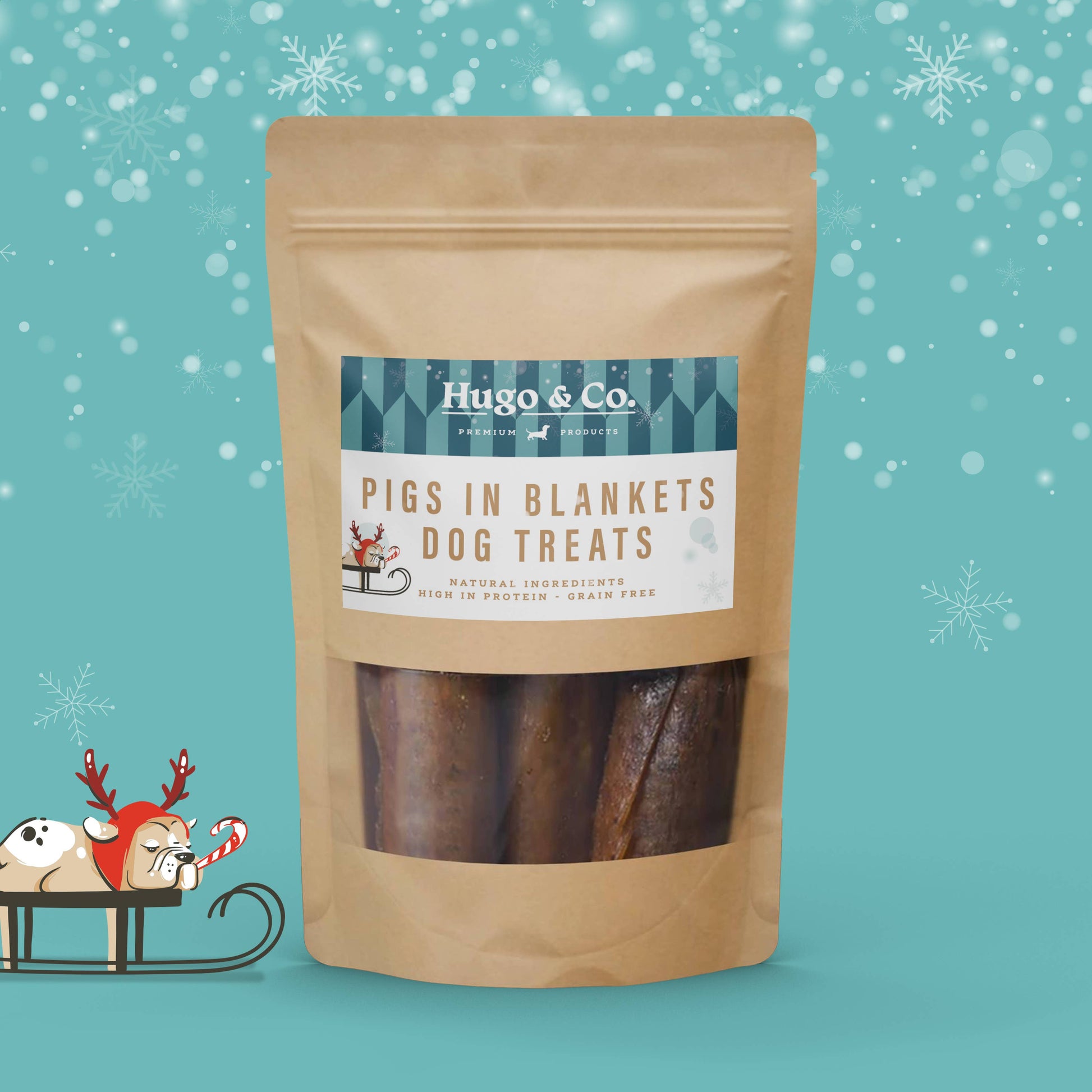 Christmas Pigs in Blankets Dog Treats -100g These delicious Pigs in Blankets Dog Treats are the perfect reward for dogs! They are made with a crunchy outside and a sausage centre for a delightful flavour that your pup is sure to love.