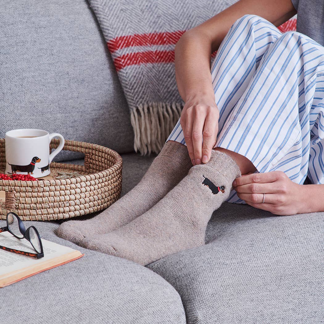 Our exceptionally soft dog walkers socks make the perfect gift for any dog lover. Not only will they keep feet warm on the daily dog walk, they are also ideal for getting cosy at home with your four legged friend. The perfect bedtime socks in the chilliest months! Featuring an adorable embroidered Dachshund on a taupe wool background.