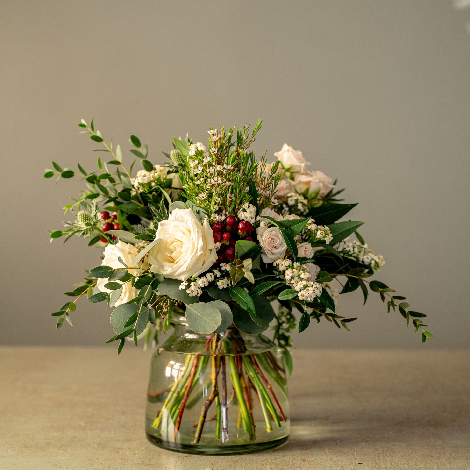 Beautiful festive bouquet made with cream roses, eryngium, berries and seasonal foliage.