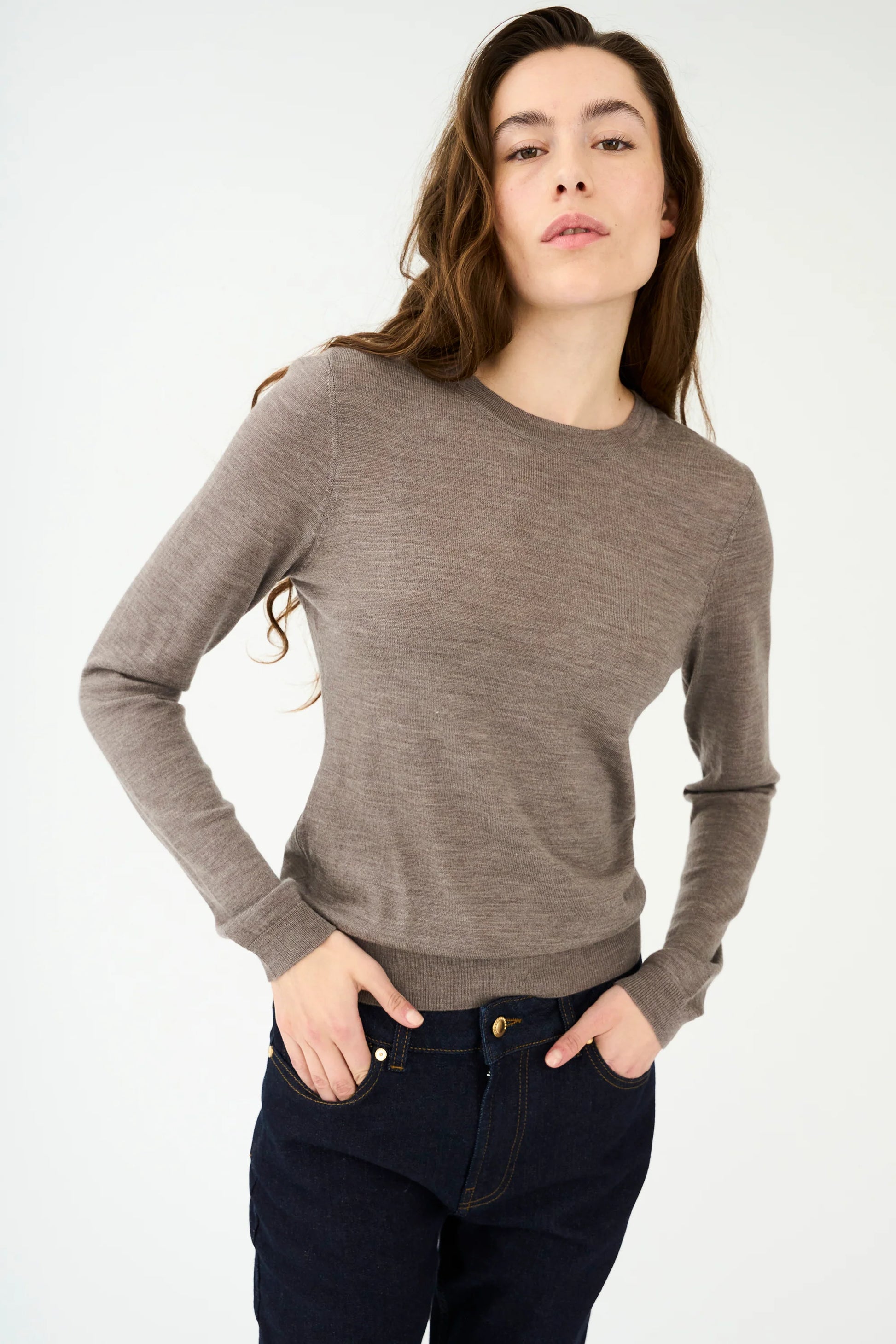 Lightweight sweater top perfect for layering or wearing on its own in this classic crew neck style with delicate rib details around the cuff and hems.