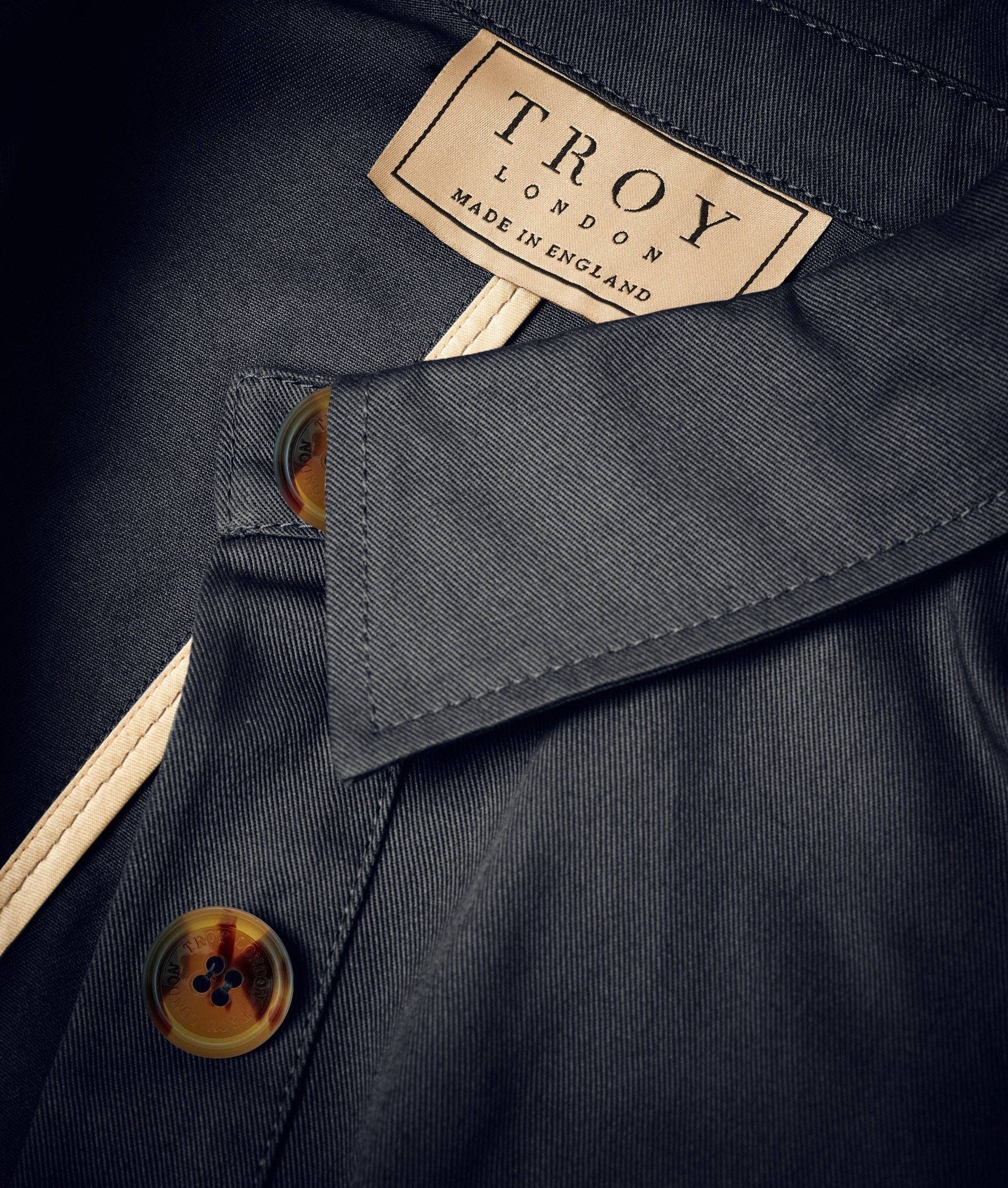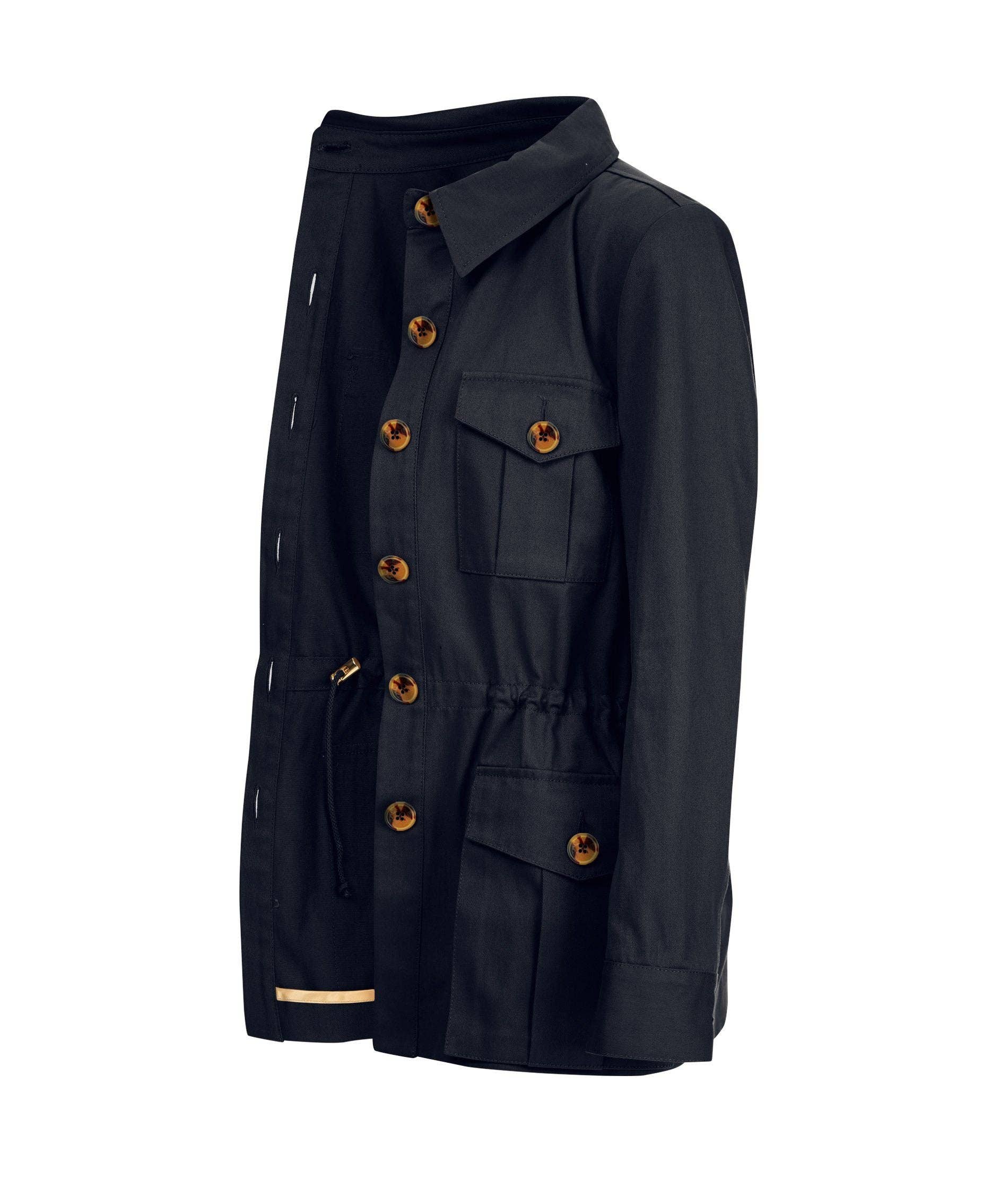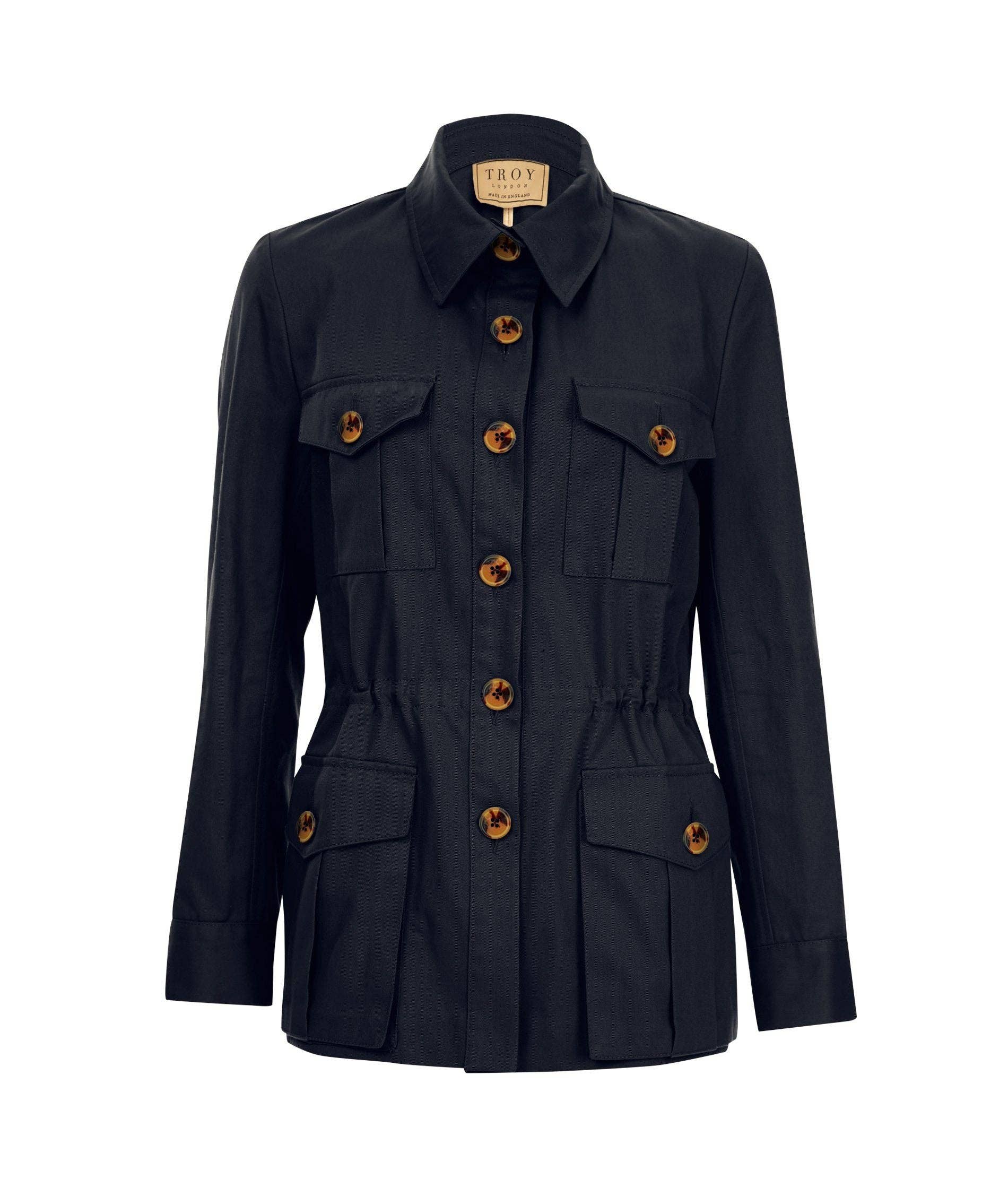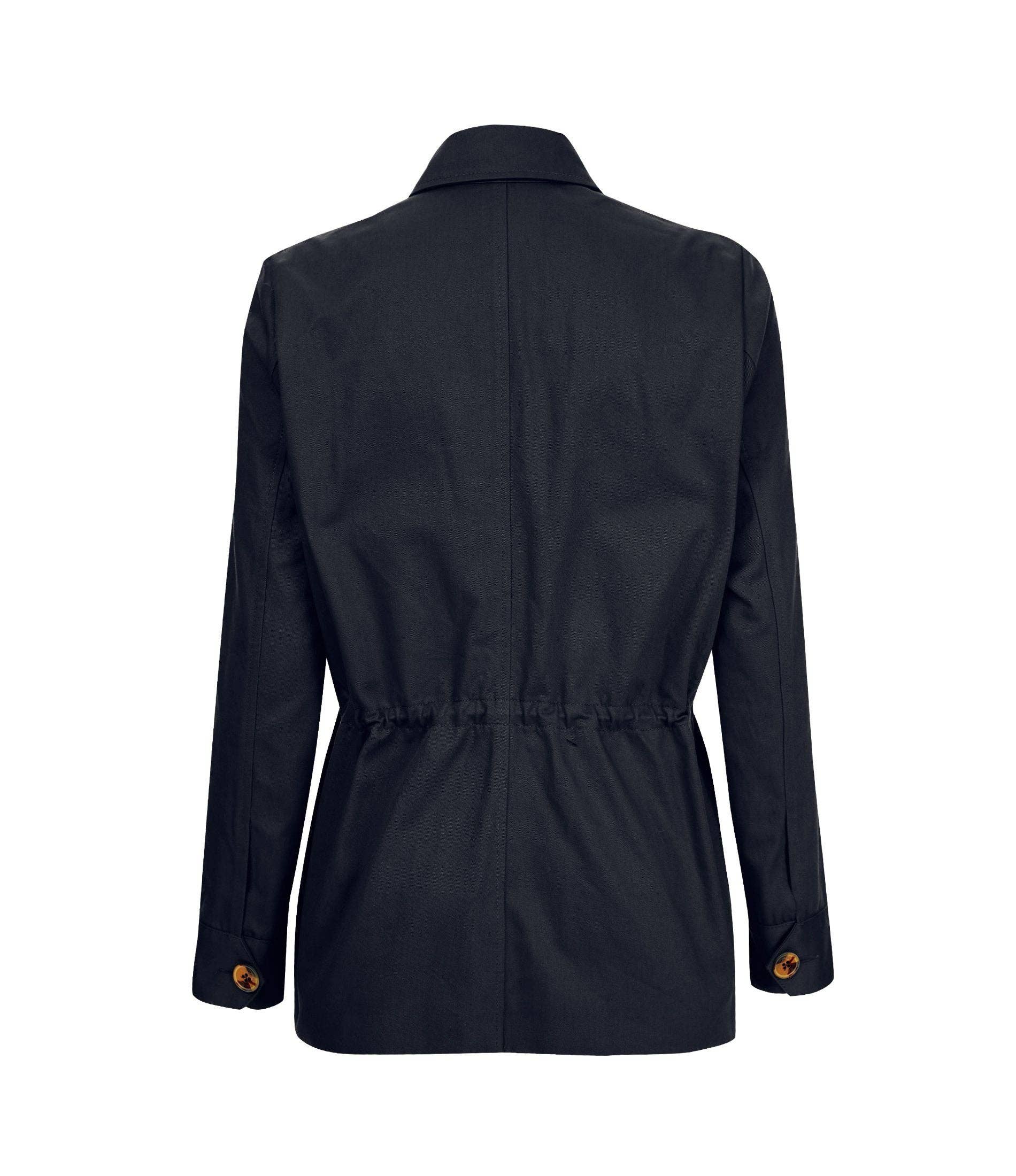 The ultimate throw-on lightweight jacket made from cotton drill. Beautifully finished inner with contrast binding in honey gold. The internal drawstring waist gives the option for a more tailored fit. Utilitarian pockets. Fastened with monogrammed buttons. Made in England.